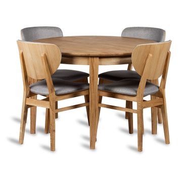 Upptäck en tidlös matgrupp som kombinerar stil och funktionalitet för att förhöja din matplats. Denna klassiska matgrupp består av ett utdragbart bord och fyra bekväma stolar, alla tillverkade i massiv oljad ek. Bordet är designat för att enkelt kunna anpassas efter dina behov med en illäggsskiva som medföljer för att ge extra utrymme när du har gäster. Den naturliga färgen på ekträet ger en varm och inbjudande känsla medan de tygklädda stolarna erbjuder komfort för långa middagar och trevliga samtal. Med en längd från 110 till 150 centimeter är detta set perfekt för både små och stora utrymmen, och det robusta materialet säkerställer att du kan njuta av din matgrupp i många år framöver. Oavsett om du planerar en intim middag eller en större sammankomst kommer denna matgrupp att vara en pålitlig och stilfull följeslagare!