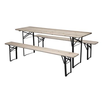 Möblera din trädgård inbjudande, charmig och praktiskt med den här matgruppen från serien Guniess. Denna fällbara matgrupp är en idealisk lösning för sommarens fikastunder. Den inkluderar ett bord och två bänkar, alla tillverkade i ädelgran och svart stål. Skapa minnesvärda ögonblick med nära och kära i trädgården!