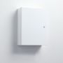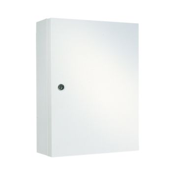 Ett barnsäkert skåp som levereras med två nycklar. Skåpet har två hyllor och kan vänster- eller högerhängas.