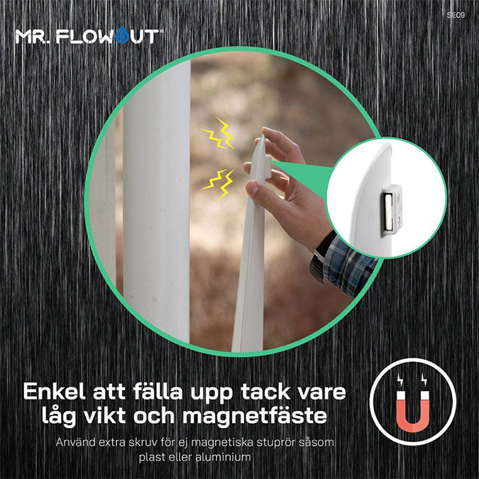 Enkel sin i utformning. Lätt i vikt, praktisk att montera och estetisk när den väl sitter på väggen, eller har fällts ut i samband med regn. Stuprännan Mr. Flowout inriktar sig på en bred målgrupp av husägare som vill hålla sin fastighet i bra skick, och som vill undvika långsiktiga problem med vatten- och fuktskador och dränering.