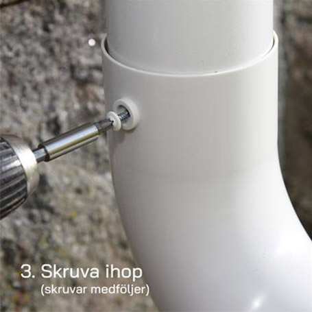 Japp, delarna levereras hopmonterade. Utkastaren sätter du enkelt på befintligt stuprör och fästs med de två medföljande skruvarna. Montaget tar max fem minuter även för den ovane hantverkaren. Rännan hålls sedan i uppfällt läge genom en magnet infälld i rännan som fäster mot stupröret och fälls enkelt ut vid regn. Rännan fälls upp/ner manuellt.