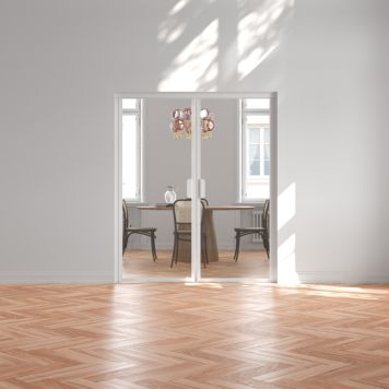 Perfekt rumsavdelare om du önskar att separera två utrymmen men samtidigt tillåta vackert ljusinsläpp genom dörrarna. De öppnar sig 90 grader i en riktining och är försedda med justerbar centrering. Öppningsriktning avgörs vid montering. Centreringen strävar efter att återställa dörren till öppen respektive stängd position och när dörrarna sluts hålls de stängda med hjälp av ett magnetlås i mitten där de möts. Rumsavdelaren är försedd med rundade halvmånehandtag som är tillverkade av mässingslegering, de är pulverlackerade i samma färg som dörrarnas aluminiumramar. Glaset är 6 millimeter tjockt härdat säkerhetsglas.