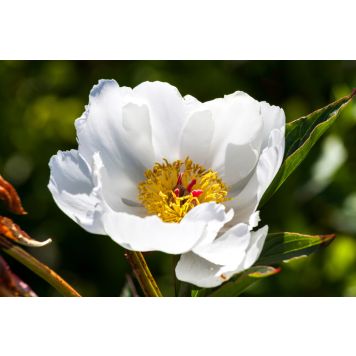Luktpion White Wings är en pion med buskigt växtsätt och blommar med enkla vita blommor med gul mitt som har en lätt doft i juni-juli. Trivs bäst i näringsrik, mull eller lerjord med jämn fukttillgång. Jorden måste vara väldränerad då pioner är känsliga för vinterfukt. Bin och humlor älskar denna blomma och den är dessutom rådjurssäker. Bilden visar växten som fullvuxen och etablerad.