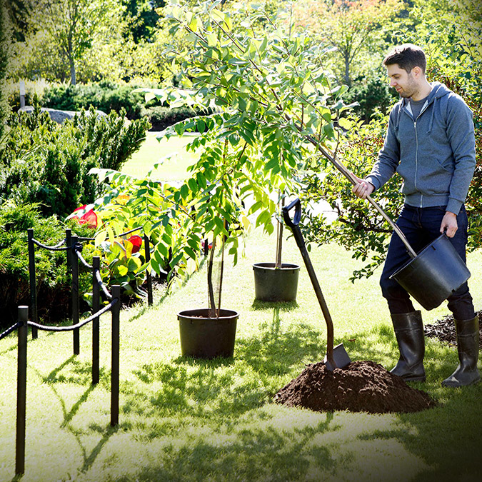 När trädet står i gropen fyller du på med jord till hälften och vattnar rikligt. När du gjort detta fyller du på med mer jord tills gropen runtom trädet är helt fylld,