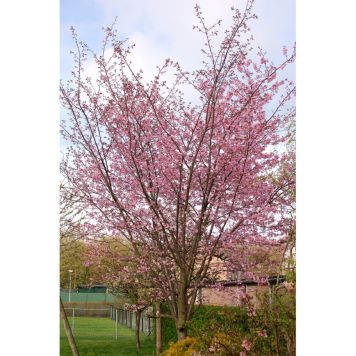 Japanskt prydnadsträd som har många fördelaktiga egenskaper. Blomningen är överdådig och bildar skyar av dekorativt fyllda rosa blommor på våren. Bladen är bronsfärgade för att sedan få en djupare rödgrön färg under hösten. Små röda frukter utvecklas även och ger ett dekorativt inslag även på senhösten. Trädet är medelstort och blir trädgårdens egna lilla pärla vid knoppsprickning. För att njuta fullt ut av dess skönhet plantera gärna som solitär i ett soligt och vindskyddat område. Kornan är rundad till växtsättet och beskärning är inte ett måste.