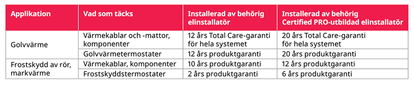 Alla Raychem golvvärmeprodukter är noggrannt testade och av högsta kvalitet så att du kan känna dig trygg med att de kommer fungera länge. När du ska installera golvvärme, välj gärna en Certified PRO-installatör. Då får du extra lång garantitid och jobbet blir utfört av en behörig elinstallatör som är speciellt utbildad inom Raychem golvvärme.