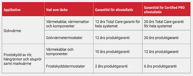 12 års totalgaranti gäller för alla våra golvvärmeprodukter när installationen har utförts av behörig elektriker. RAYCHEM lämnar dessutom 20 års totalgaranti om installationen är utförd av en Certified PRO installatör. Om ett fel uppstår reparerar vi eller byter ut produkten och återställer golvet till likvärdig standard – utan kostnad. För mer information, ladda ner RAYCHEM'S fullständiga garantivillkor på deras hemsida.