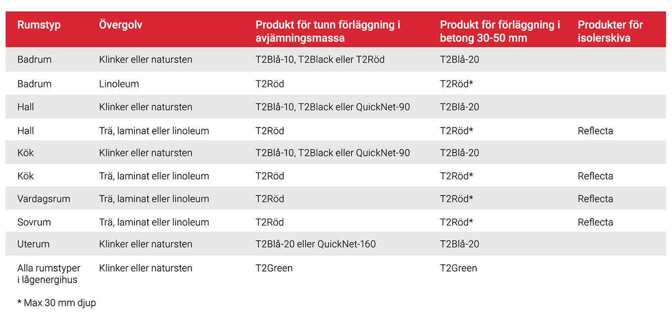T2Röd är bästa alternativet för trä-, laminat- och linoleumgolv, men går att använda under alla typer av övergolv.