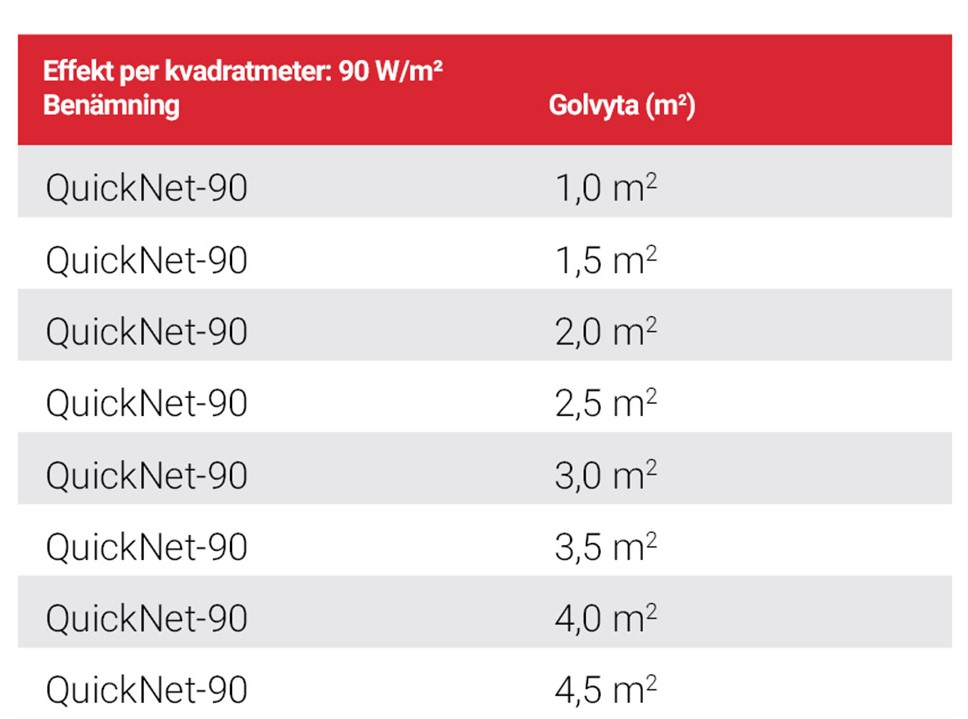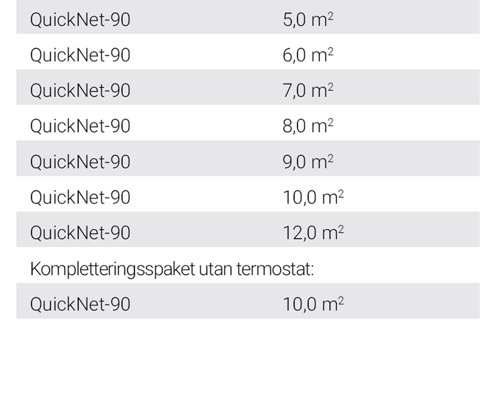 • För utrymmen som behöver högre effekt, t ex källare och uterum, finns QuickNet 160 W/m2.