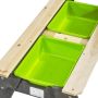 Bordet har två avtagbara gröna baljor som enkelt fylls med vatten, sand eller småleksaker. De kan också lyftas ur för enkel rengöring – praktiskt för både föräldrar och små äventyrare. När det är dags att byta aktivitet lägger du bara på locket, och bordet förvandlas till en perfekt yta för pyssel, ritande eller legobygge.