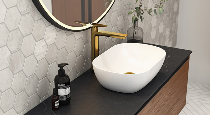 Du kan välja mellan svart, vitt eller vacker valnöt och tre olika typer av tvättställ med möjlighet till olika bänkskivor.