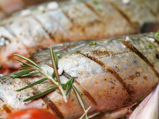 Börja vid låg värme och skruva upp värmen först när öringen är klar för att få lite färg och knaprighet på skinnet. Lägg upp Öringen på en tallrik. Servera med grillad potatis, potatissallad eller grön sallad. Tips: öring och makrill är särskilt lämpliga för grillning. Kungräkor eller scampi går också utmärkt att grilla (grilla alltid med skalen på!). Lax, kammusslor, marulk och hälleflundra är perfekta för fiskspett.