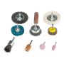 Består av: Polerskiva 75 mm, polervax, stålborste 75 mm, stålborste riktad fram 50 mm, stålborste riktad fram 24 mm, rengöringsskiva 50 mm, lamellsliptvissa 40mm, runt slipstift, konisk slipstift, klickfäste