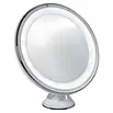 En rund och ensidig sminkspegel som står på en liten pedistal och sminkspegeln har en sugpropp för väggmontering. Sminkspegelns belysning är b...