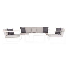 Förvandla din uteplats till en stilfull oas med detta eleganta loungeset. Med en kombination av sandfärgad aluminiumram och teakarmstöd erbjuder denna möbelgrupp både komfort och hållbarhet. Den tresitsiga soffan och loungestolen är perfekta för avkoppling, medan de två soffborden ger gott om plats för dina favoritdrycker och tilltugg. Setet är designat för att ge ditt utomhusutrymme en modern och inbjudande känsla, vilket gör det till ett utmärkt val för både små och stora trädgårdar!