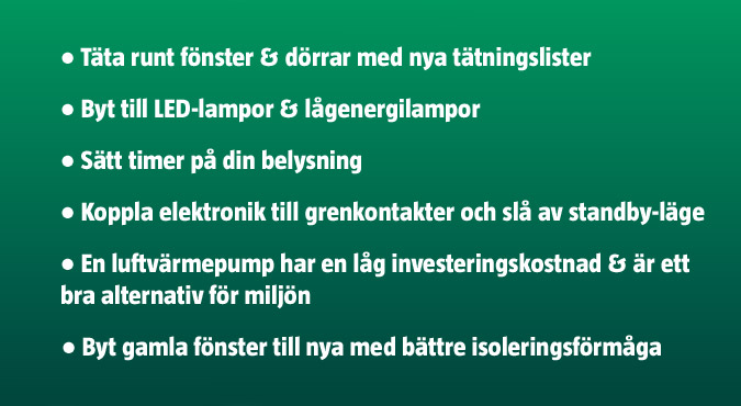 - Släcka lampor i rum där du inte vistas i och byt ut gamla lampor till LED-lampor och lågenergilampor.