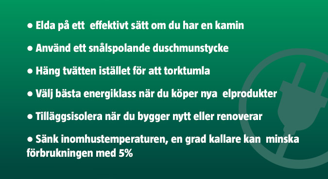 - Stänga av golvvärmen, handdukstork mm när de inte används eller behövs.