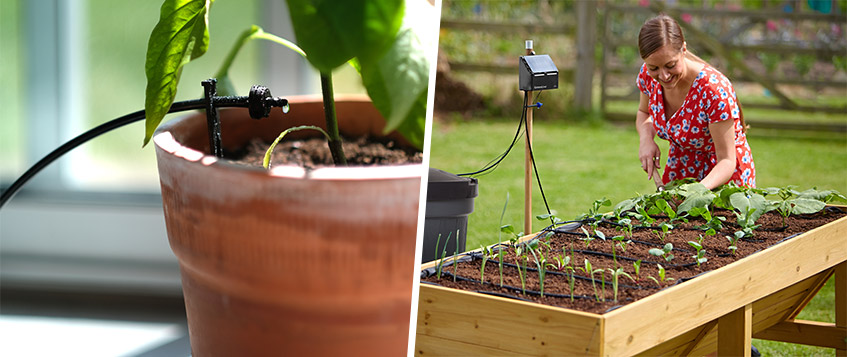 Det automatiska bevattningssystemet EcoAqua finns i två kompletta set med slangar, 12 eller 24 droppmunstycken och IDC-station.