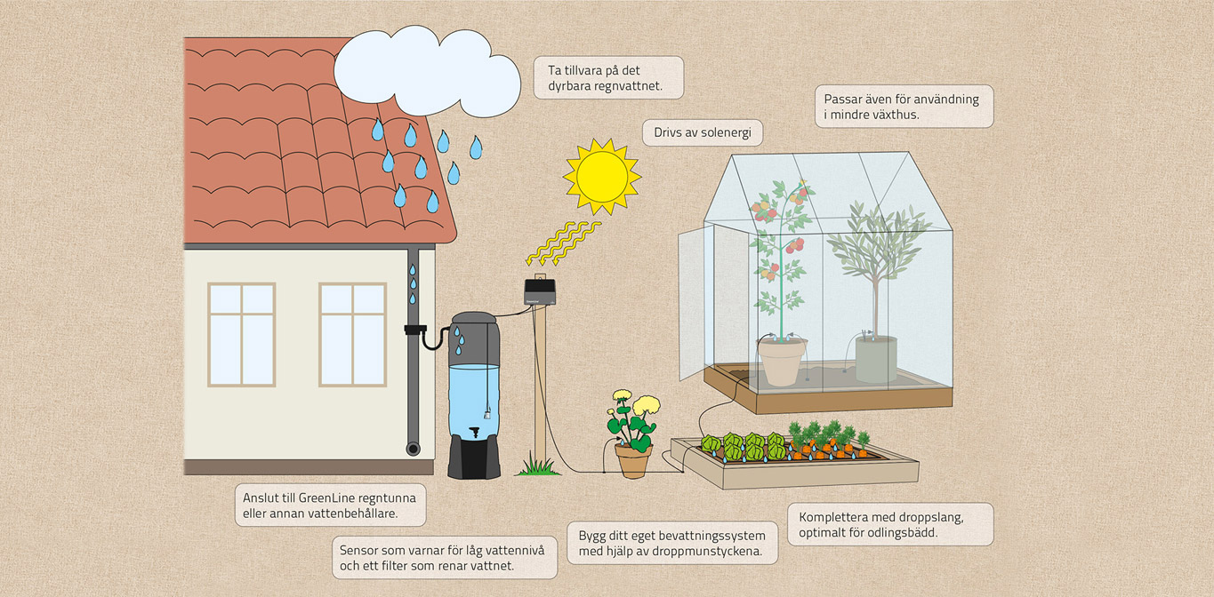 GreenLines regntunnor finns i två storlekar (100 och 200 liter) och kopplas direkt till stupröret. När tunnan är full fortsätter vattnet ner i stupröret och ut i det vanliga dagvattensystemet. Med tappkran för att smidigt kunna fylla en vattenkanna samt med en anslutning som passar till de flesta trädgårdsslangars munstycken. Vattna sena kvällar eller tidigt på morgonen. När du vattnar i sval jord så avdunstar mindre vatten än i varm jord på dagen.
