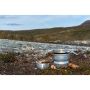 Komplett stormkök som passar perfekt till 3-4 personer. Ta med det ut i naturen och avnjut en god måltid. Det är gjort av ultralight aluminium vilket är 50% starkare än vanligt aluminium. Köket har därför kunnat göras tunnare och har tack vare detta en lägre vikt. Det tvådelade vindskyddet är stommen i detta stormkök. Lufthålen på det undre vindskyddet riktas mot vinden för att öka syretillförseln till brännaren. Spritköket drivs av Tenol eller T-röd. Det är bränslen som är billiga, säkra och lättillgängliga.