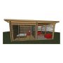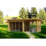 En stuga som erbjuder en inomhusdel med eleganta skjutpartidörrar i fyra delar på två sidor, vilket ger ett härligt ljusinsläpp. Stugan har en unik karaktär med sitt pulpettak och tryckimpregnerade ribbor som omger den takade utedelen. Den levereras som en komplett byggsats med färdigkapade och numrerade delar för snabb och enkel montering. Skjutpartidörrarna är tillverkade av lackad aluminium och har härdat enkelglas. Planlösningen omfattar en byggyta på cirka 18 kvadratmeter, med en storstuga på 9 kvadratmeter och ett öppet rum på cirka 7 kvadratmeter.