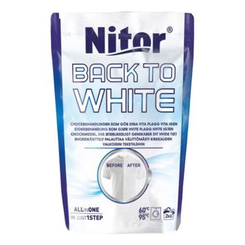 Nitor Back to white är produkten för återfärgning till ursprungsfärgen. Ett effektivt sätt att tvätta tillbaka färgen på vita plagg. Följande tyger kan återfärgas med Back to: bomull, linne, viskos, juteväv samt tyger med minst 50 % av dessa fibrer.