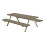 Komplett trädgårdsmöbel lämplig för barn med bord och bänkar av målat trä i gråbrun kulör och ramverk i varmgalvaniserad metall.