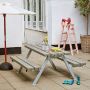 Komplett trädgårdsmöbel lämplig för barn med bord och bänkar av målat trä i gråbrun kulör ...