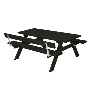 Bord/bänkset komplett med 1 ryggstöd, plankor och stödben i trä. Hela setet är tryckimpregnerat och grundmålat i svart färg.