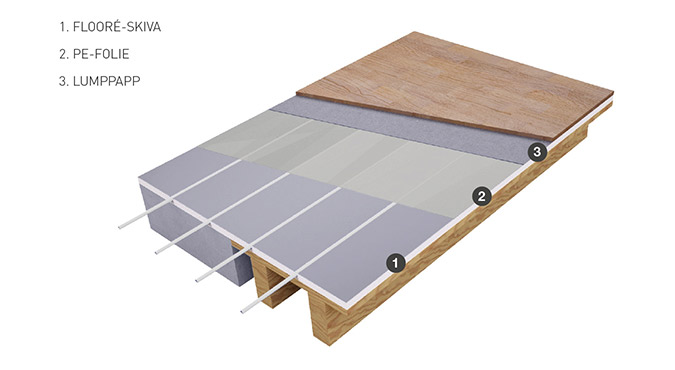 Trägolv kan läggas direkt på Flooré skiva tack vare att skivan har så hög tryckfasthet. Skivan fäster du i underlaget med dubbelhäftande mattejp. Om undergolvet är av trä kan du istället välja att häfta eller skruva fast skivorna.