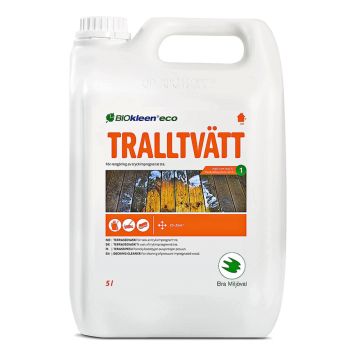 Tralltvätt Eco används för att rengöra altan och trall. Produkten är speciellt effektivt för rengöring på djupet av tryckimpregnerat trä, även vid kraftig beläggning av smuts, sot eller alger. Märkt med Bra Miljöval.