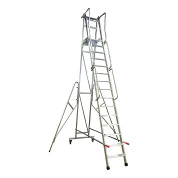 Denna mobila arbetsplattform är den perfekta lösningen för arbeten på högre höjder där säkerhet och stabilitet är avgörande. Plattformen är tillverkad av halksäker aluminium-durk och har fotlister som tydligt markerar ytterkanterna, vilket ger dig trygghet under arbetet. Med ett rejält räcke på tre sidor och en praktisk avlastningsyta framtill, blir din arbetsplats både säker och funktionell. Plattformens storlek ger gott om utrymme, och de kraftiga hjulen samt greppvänliga handtagen gör det enkelt att flytta plattformen mellan olika arbetsplatser. Trappans steg har rillor för extra halkskydd, vilket tillsammans med den starka kragningstekniken ger en stabil och hållbar konstruktion. För extra säkerhet kan du komplettera med en fällbar skyddsbur som ger fallskydd på alla fyra sidor.