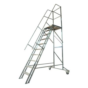 Denna hjulförsedda trappstege med plattform och säkerhetsräcke är den perfekta lösningen för dig som behöver en snabb och säker arbetsplats ovan mark. Med sin lätta konstruktion och låsbara hjul är den enkel att flytta runt. Stegen och plattformen är tillverkade av räfflad halksäker aluminium, vilket ger extra trygghet under arbetet. Trappan levereras ihopfälld och är i ett blankförzinkat utförande, vilket ger både hållbarhet och ett stilrent utseende.