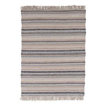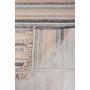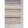 En handvävd ullmatta som kombinerar dekorativa detaljer med en känsla av lyx. Med en bas i beige och inslag av blåa nyanser, ger den ditt hem en varm och inbjudande atmosfär. Mattan är skapad med olika vävtekniker för att ge en varierad struktur, och fransarna på kortsidorna bidrar till en traditionell look!