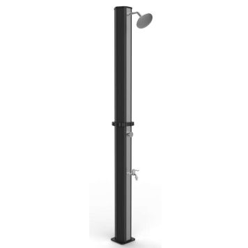 Denna soldusch fungerar så att vattnet värms upp i trädgårdsduschen och regleringen mellan kallt och varmt vatten görs via den inbyggda blandaren. Duschen kan ställas upp på en plan yta och ansluts till en trädgårdsslang. Denna tvådelade modell i rostfritt material är mycket lätt att hantera och att förvara efter säsongen. Solduschen är praktisk även när du varit på stranden eller blivit smutsig efter hårt trädgårdsarbete så kan du enkelt skölja av dig.