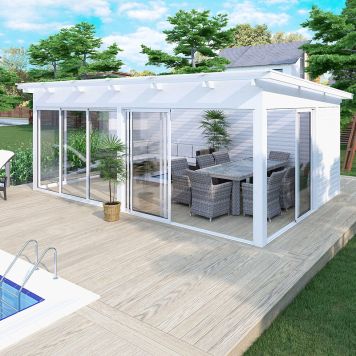 Fristående uterumsats som innehåller limträstomme, kanalplasttak och glaspartier. Modell Haverdal Mertid, är anpassad att användas från tidig vår till sen höst. Ett fristående uterum är det perfekta uterummet för dig som vill förändra din trädgård och få en mysig oas att njuta i, utan att behöva göra några ingrepp i ditt hus.Uterummet är det perfekta rummet vid poolen, spabadet, relax eller kanske att nyttja som ett växthus.