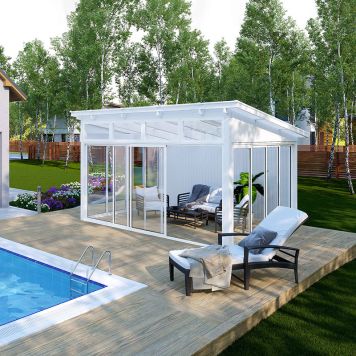 Fristående uterumsats som innehåller limträstomme, kanalplasttak och glaspartier. Modell Laholm Fritid, är anpassad att användas under sommarsäsongen. Ett fristående uterum är det perfekta uterummet för dig som vill förändra din trädgård och få en mysig oas att njuta i, utan att behöva göra några ingrepp i ditt hus: Uterummet är det perfekta rummet vid poolen, spabadet, relax eller kanske att nyttja som ett växthus.