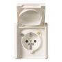 1-vägs, utanpåliggande, 30 mA. Ytterligare vägguttag kan seriekopplas, vilka då också blir skyddade mot jordfel av den inbyggda jorfelsbrytaren. Uttaget är försett med svart knapp för till- och frånslag och en gul knapp för test. Jussi-serien i färgstabilt material som inte gulnar.