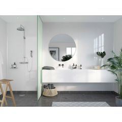 Fibos väggsystem består av laminerade väggskivor som är godkända för användning i våtrum. Skivorna är byggda med en kärna av vattenresistent plywood och en yta av högtryckslaminat – ett material som tål daglig kontakt med vatten och fukt utan att påverkas. De monteras med klicksystem (Aqualock), vilket ger täta fogar utan behov av kakel, fogmassa eller lång torktid. Resultatet är ett tätt, lättskött och stilrent väggsystem som håller över tid.