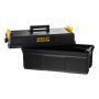 Detta är en verktygslåda med flera funktioner i ett. Använd den som verktygslåda, som pall eller som verktygslåda på ben. Den har en lastkapacitet på hela 30 kilo och välorganiserad förvaring av mindre elverktyg och handverktyg. Det ergonomiska handtaget gör att du enkelt kan ta med dig lådan och i dess lock finns stålben som vecklas ut för att skapa en robust pall att sitta eller stå på. Pallen kan även användas som förhöjning till verktygslådan som spänns fast med sina klämmor. Verktygslådans innerväska är försedd med ett eget handtag, så att den enkelt kan lyftas ur.