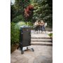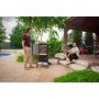 Det är gott om plats, fyra nivåer med rostfria galler. Grillen drivs med gasol och har en 4,4 kW brännare och ett effektivt ventilsystem utvecklat för maximal styrning och kontroll. En utfällbar droppbricka ger spillfri transport av maten till och från röken. Lock av gjuten aluminium och dubbla väggar i stål gör att värme och rök stannar kvar inuti skåpet. Två dörrar gör det enkelt att komma åt vätskebehållare och rökbox.