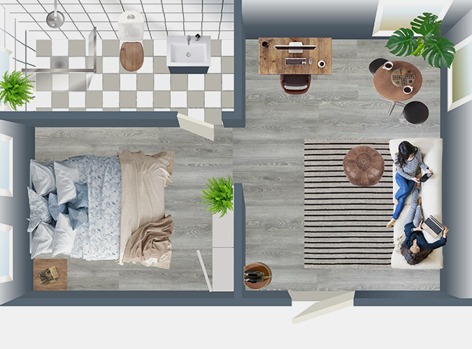 Tonårslyan är inredd med ett vardagsrum på 10 kvm, sovrum ca 8,5 kvm och badrum ca 3,5 kvm. Här får man plats med både en mysig soffa, barbord och stolar som mat/fikaplats samt skrivbordsplats. Sovrummet med en 140 bred säng har även plats för garderobenhet 150×44, där man med fördel väljer skjutdörrar för att utrymmets skull.