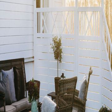 Vitmålad skärm som varvar liggande paneler med ribb- och kryssmönster upptill. Salvia staket skärmar både av uteplatsen, samtidigt som springorna skapar en ljusare känsla och skönt luftgenomsläpp.