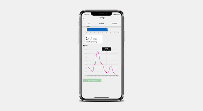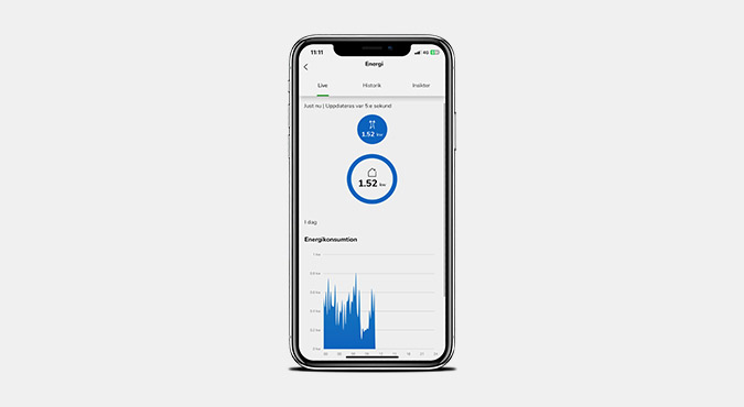 I appen ser du hur mycket energi hemmet förbrukar i realtid. Systemet låter dig även se din historiska förbrukning per timme, dag, vecka, månad och år.