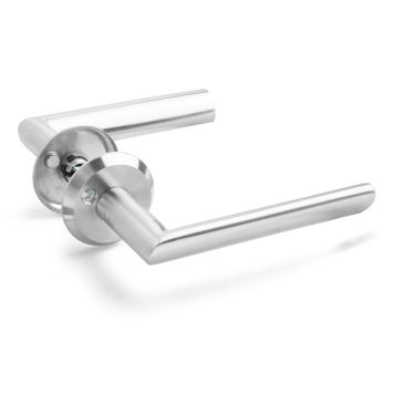 Dörrhandtag av rostfritt stål med dubbelverkande returfjäder avsett för ytterdörr med modullåskista. Passar till dörrtjocklek 38-70 mm. Utsprång 70 mm. Finns även som innerdörrhandtag.